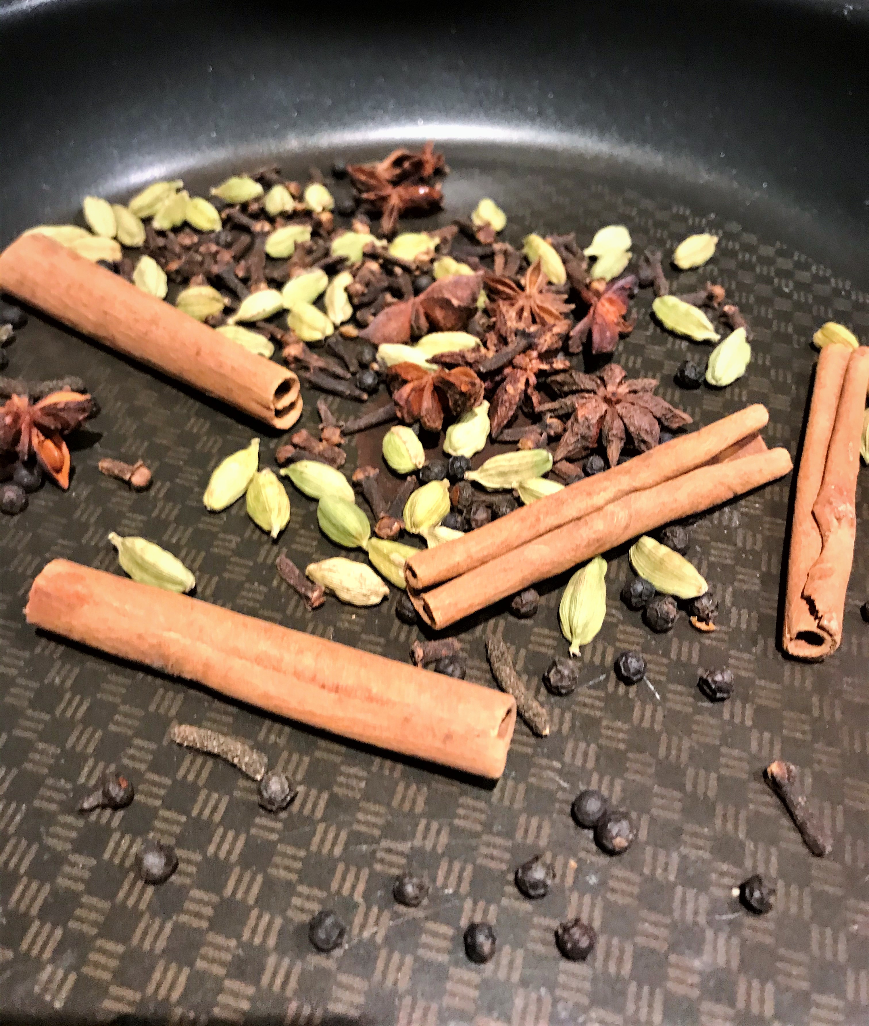 Das Wasser zum Kochen bringen, den Zucker in das Wasser geben und einkochen. Gleichzeitig die Gewürze (bis auf den Ingwer) in einer Pfanne trocken anrösten, bis sich das Aroma entfaltet.