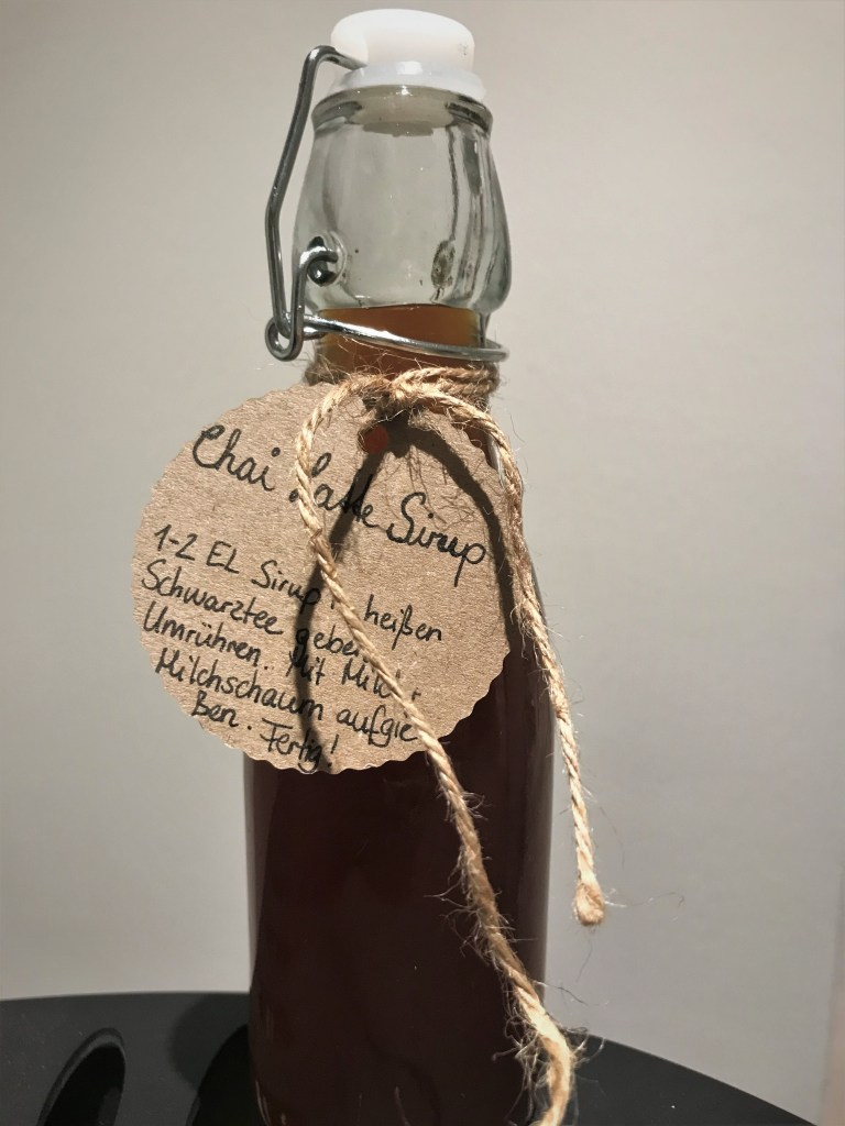 Ein selbstgemachter Chai-Latte-Sirup ist ein tolles Geschenk in der kalten Jahreszeit. Und der Chai-Latte schmeckt doch direkt viel besser, wenn er nicht aus einem fertigen Teebeutel oder als Pulver daher kommt. 🙂 Ganz abgesehen von dem unvergleichlichen Duft, der durch das Haus zieht, wenn die Gewürze ihr Aroma in der Pfanne entfalten.