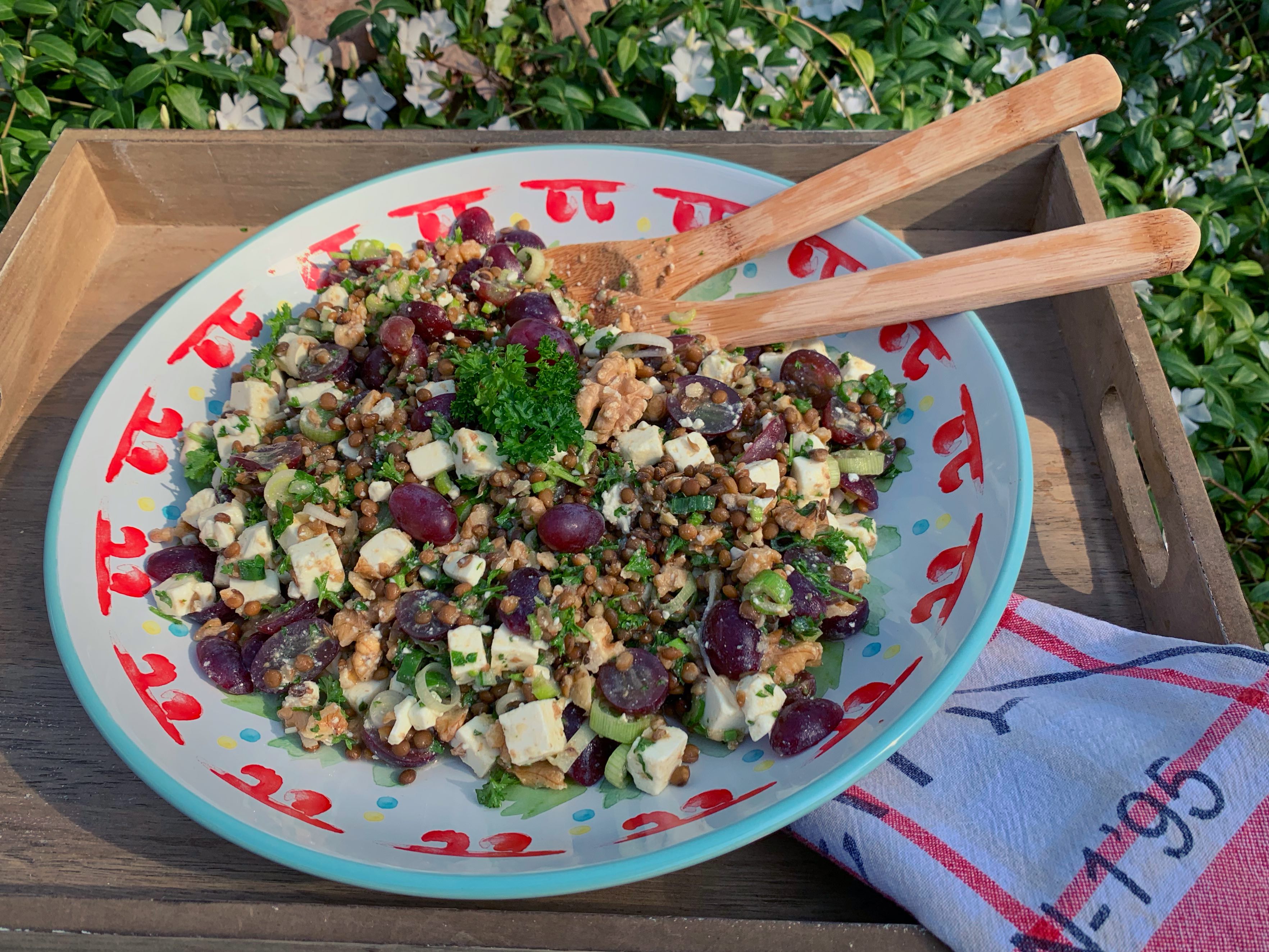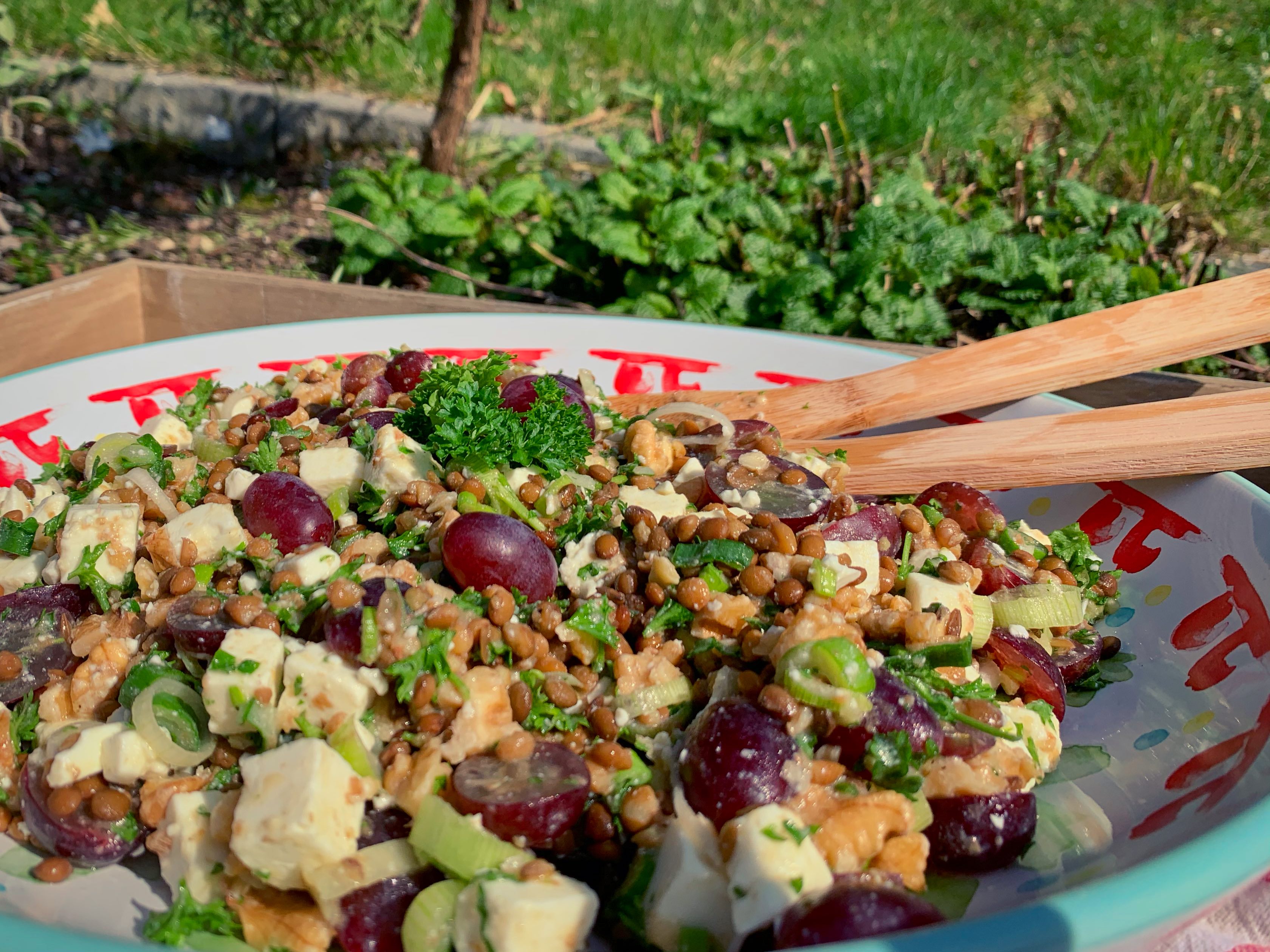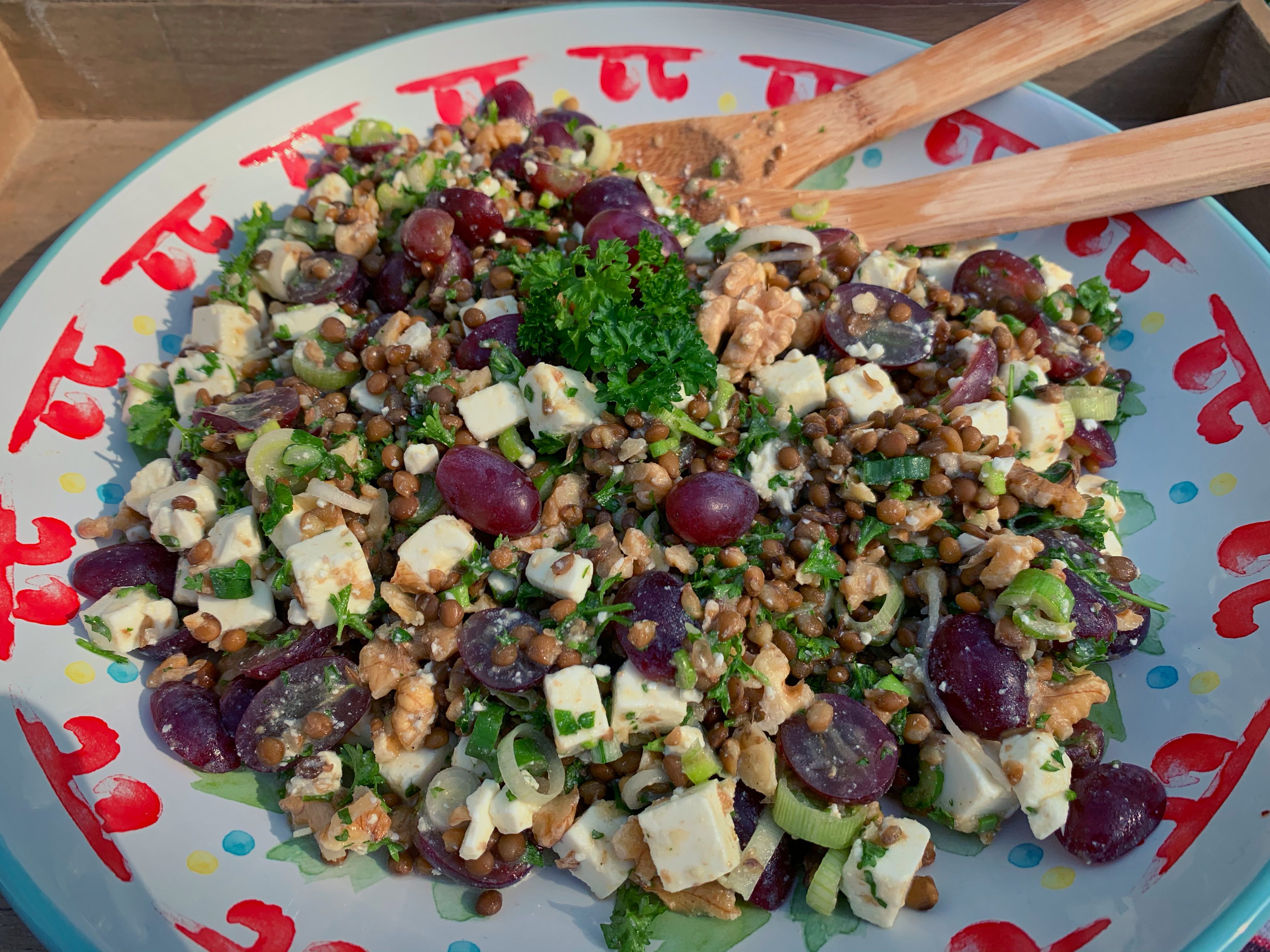 - Linsen abbrausen. Lauchzwiebeln in feine Ringe schneiden. Feta würfeln. Trauben halbieren. Petersilie hacken.