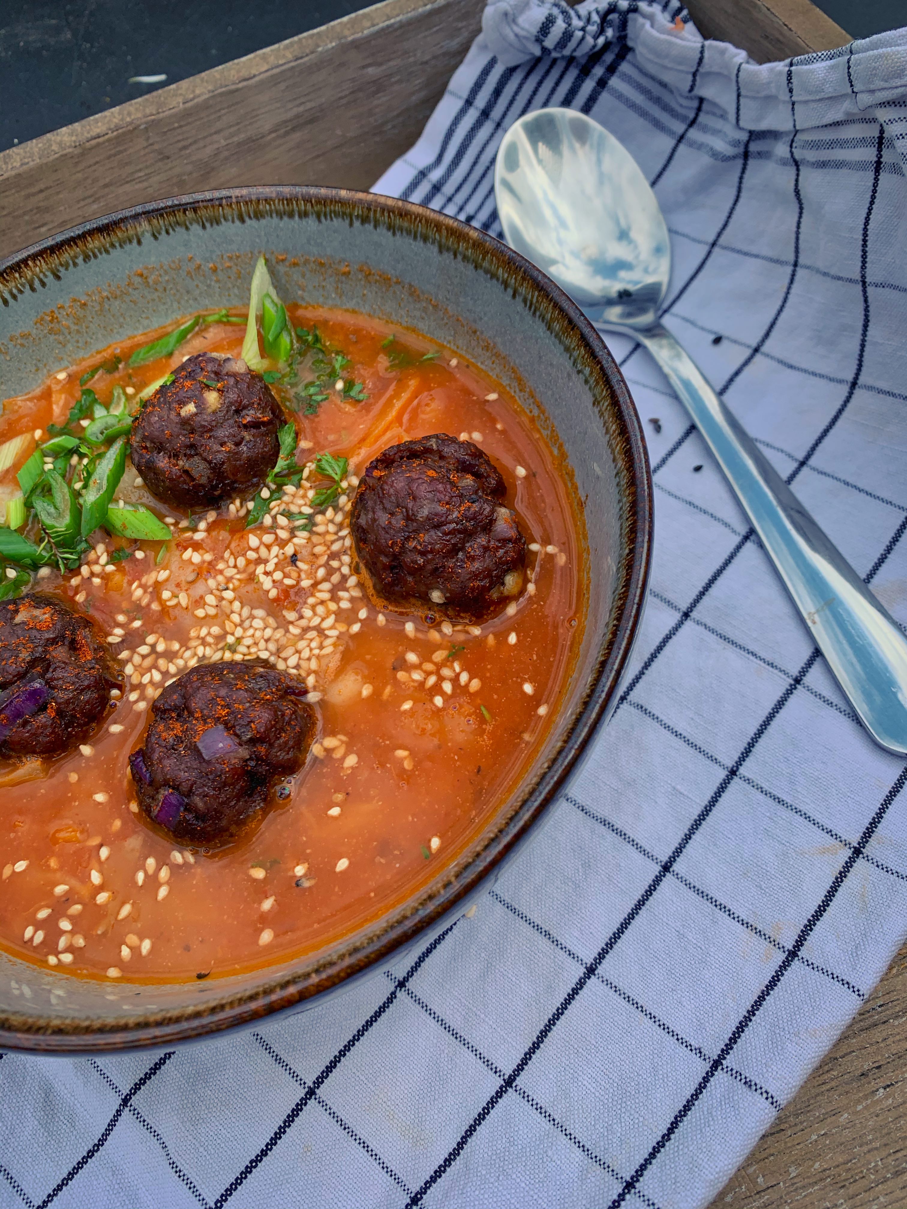 Die Hackbällchen in der Suppe kann man natürlich nach eigenem Belieben würzen. Passend zu dieser Suppe habe ich mich deshalb für Gewürze wie Kreuzkümmel, frisch gemahlenen Piment und Fenchelsamen entschieden. Ob du deiner Hackmasse nun ein Ei zugibst, etwas Senf oder es relativ „pur“ lässt, ist dir selbst überlassen. Vor kurzem habe ich schon einmal orientalische Hackbällchen zubereitet. Dort habe ich z.B. Mandelsplitter und Rosinen zugefügt. Auch das fand ich sehr lecker. Heute habe ich auf diesen Zusatz verzichtet.