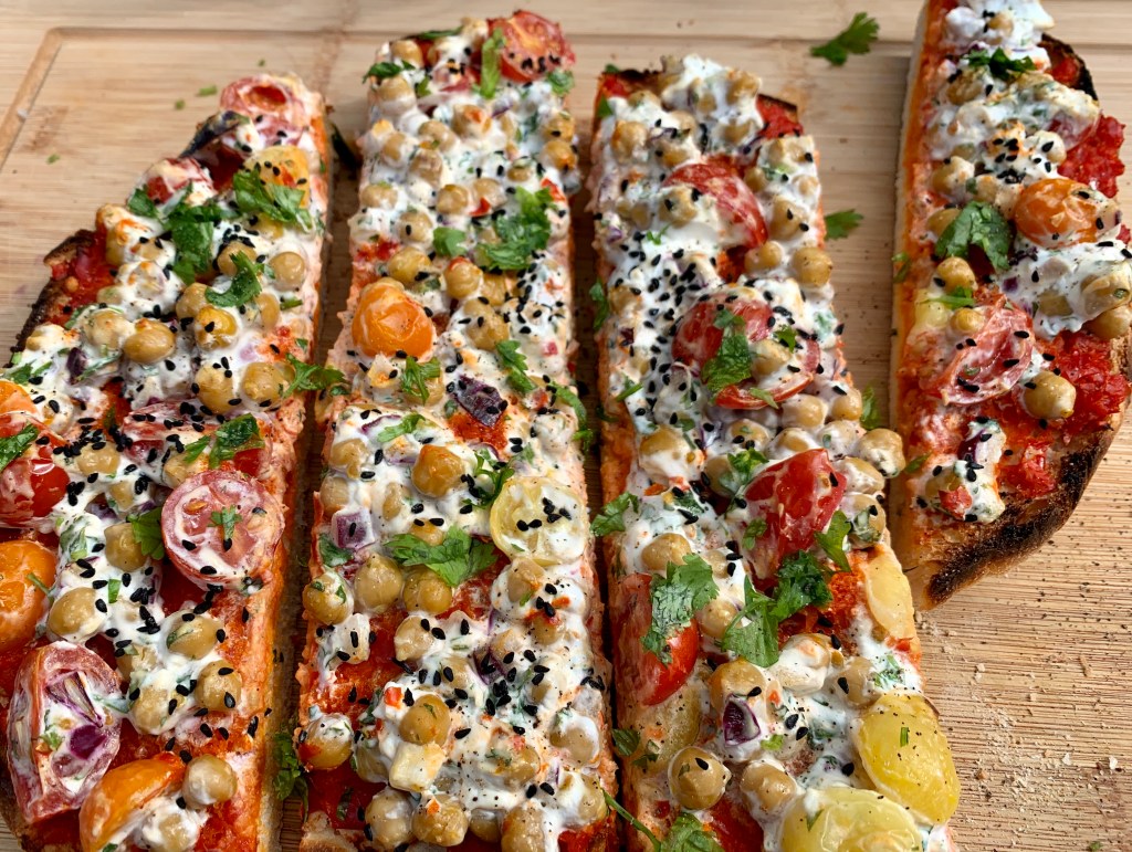 - Fladenbrot horizontal durchschneiden und unter dem heißen Backofengrill auf beiden Seiten leicht bräunen. Brot herausnehmen und mit Ajvar bestreichen. Kichererbsen-Mix darauf verteilen. Mit Schwarzkümmelsamen bestreuen. Belegte Brothälften wieder unter den Grill schieben, bis der Käse zu schmelzen beginnt. (ca. 5 Minuten)