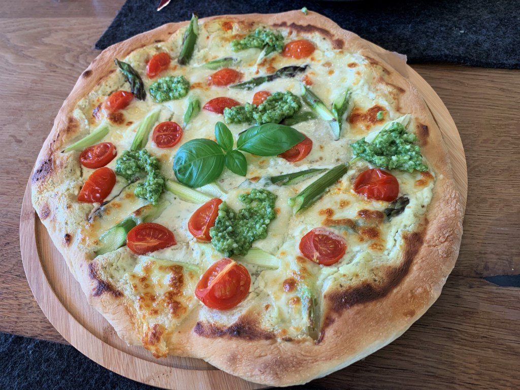 - Die Pizza mit der Creme bestreichen und mit Spargel und Kirschtomaten belegen. Nun den Mozzarella auf die Pizza legen.