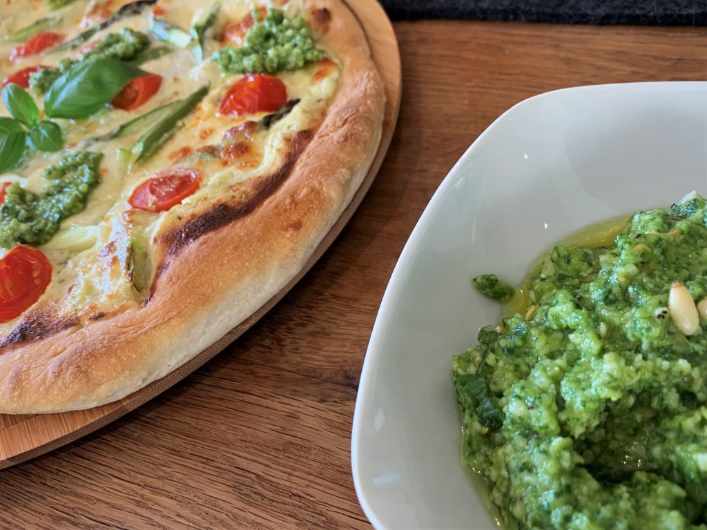 - Die Pizza aus dem Ofen holen und etwas Pesto in Klecksen auf der Pizza verteilen. Den Rest des Pestos bitte gut aufbewahren und am nächsten Tag mit Pasta genießen.