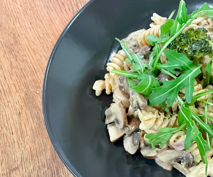 - Gib nun die Champignons, Zwiebel- und Knoblauchwürfel, die Brokkoliröschen, die Nudeln, Gemüsebrühe, Sahne und den Pfeffer in einen großen Topf und verschließe ihn mit einem Deckel. Lasse die Zutaten aufkochen und anschließend 10 Minuten lang bei mittlerer Stufe köcheln.