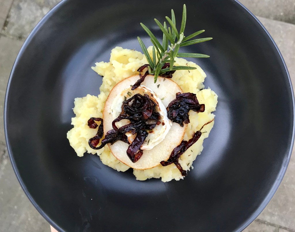 - Birne und Ziegenkäse in Scheiben schneiden. Den Ziegenkäse auf die Birnenscheiben setzen, mit Honig bestreichen und Rosmarinnadeln bestreuen. Im vorgeheizten Ofen bei 200 Grad mit der Grillfunktion ca. 5 Minuten gratinieren.