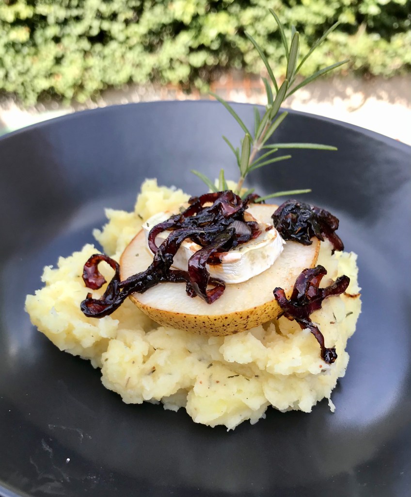 - Kartoffeln schälen und kochen. Abgießen und einen guten Schluck Milch dazugeben, ebenso Butter. Beides auf der warmen Herdplatte warm werden lassen. Eine gepresste Knoblauchzehe und etwas Thymian dazugeben und stampfen. ( ich habe die Kartoffeln abgegossen und ausdampfen lassen. In der Zwischenzeit habe ich den Rest zubereitet. Danach dann erst das Püree gestampft. So ist es frisch.