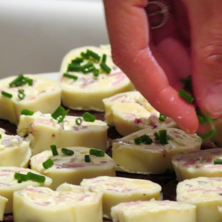 Goudaröllchen auf Pumpernickel-Taler
